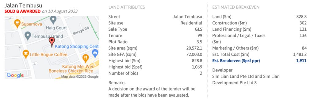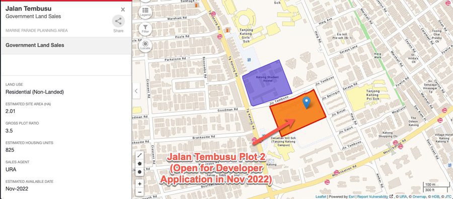The first Jalan Tembusu GLS land plot, located beside Haig Court, was awarded to CDL in Jan 2022, at a land cost of $1,302 psf ppr, and can yield 645 units.